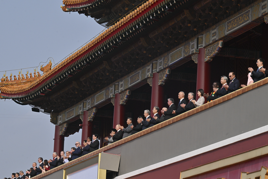 9月3日,纪念中国人民抗日战争暨世界反法西斯战争胜利80周年大会在北京天安门广场隆重举行。这是大会开始前,中共中央总书记、国家主席、中央军委主席习近平同出席大会的外方代表团团长前往天安门城楼。
