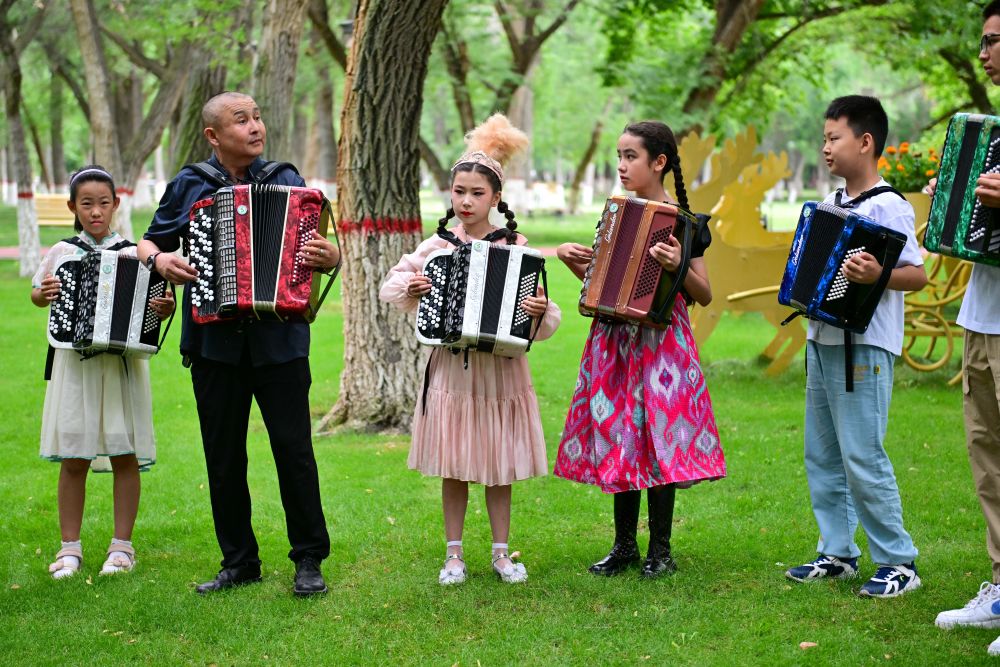 2024年7月24日,在新疆塔城市文化广场,手风琴文化传承中心老师道吾然·对山汉(左二)带领学生练习手风琴。塔城市居住着汉族、哈萨克族、回族、维吾尔族、蒙古族、塔塔尔族、俄罗斯族等20多个民族,是一片多元文化沃土。手风琴是塔城市民间最广为流传的乐器,也是各族人民文化交流的重要媒介。近年来,塔城市深入挖掘手风琴文化,举办多场手风琴文化艺术节活动,为各民族文化交流提供平台。
