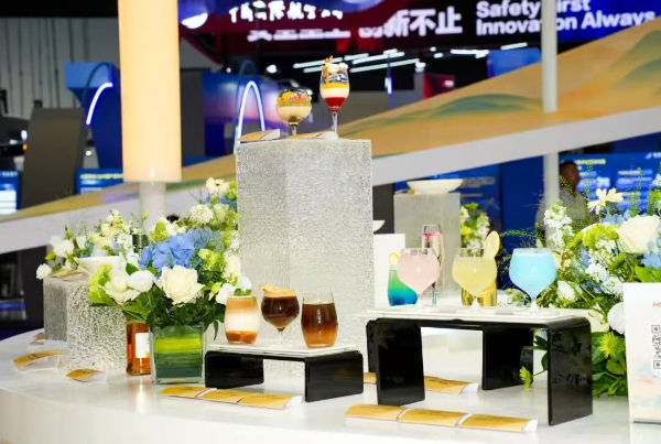 活动期间,新海航航空集团将空中餐厅搬到展厅,为观众带来一场沉浸式美食体验。现场展示了旗舰航司海南航空与洲际酒店集团旗下彩丰楼、恰餐厅及酒吧联合打造的“祥云珍馐”系列餐饮产品,如祥云桂花熏鲷鱼、淮扬府联名点心、碳烤鲍鱼配海南菠萝脆片等。观众还可以现场品尝手磨咖啡以及海南航空机上饮品海岛明珠、椰香茉荔、琼中琥珀等,感受云端旅程的优雅与惬意,体验航空服务的温暖与贴心。