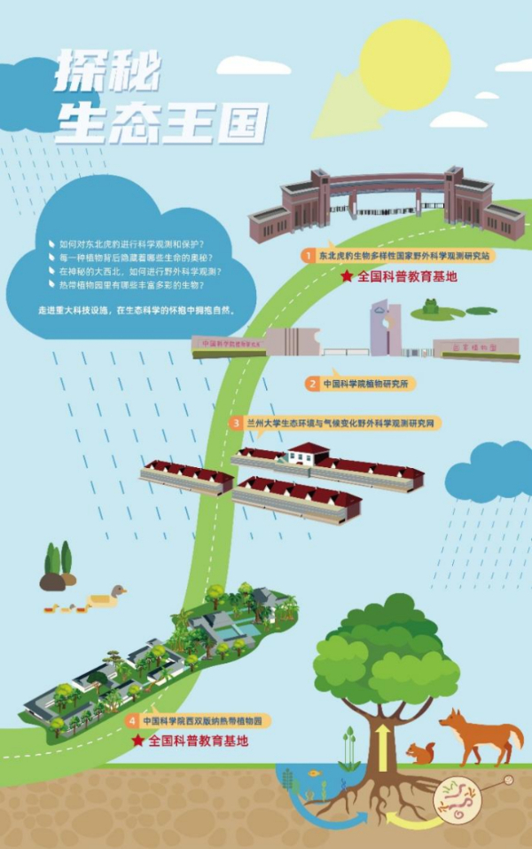 本期推出“探秘生态王国”主题探索路线,带你走进北京师范大学东北虎豹生物多样性国家野外科学观测研究站、中国科学院植物研究所、兰州大学生态环境与气候变化野外科学观测研究网和中国科学院西双版纳热带植物园,遨游在自然生态的画卷里,感受科技带来的生态之美。