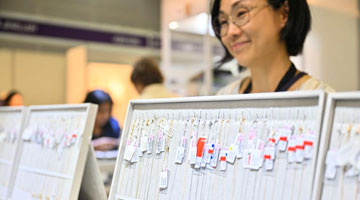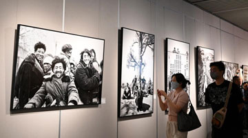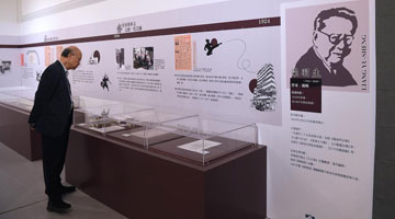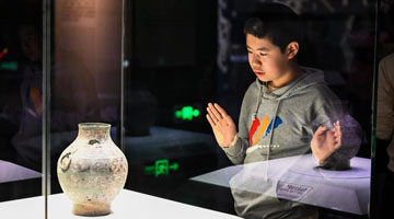 5月11日,参观者在希腊雅典扎皮翁宫观看中国石窟艺术介绍。