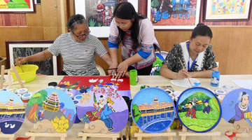 7月3日,工作人员(左)在向参观者讲解一组马可·波罗相关文献资料的展品。