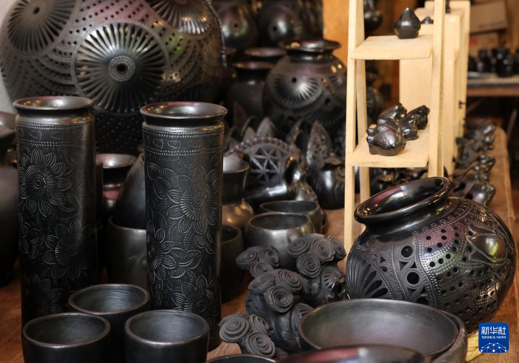 9月14日,在墨西哥瓦哈卡州的圣巴托洛科约特佩克市,黑陶手工艺者展示不同步骤下的黑陶制品。