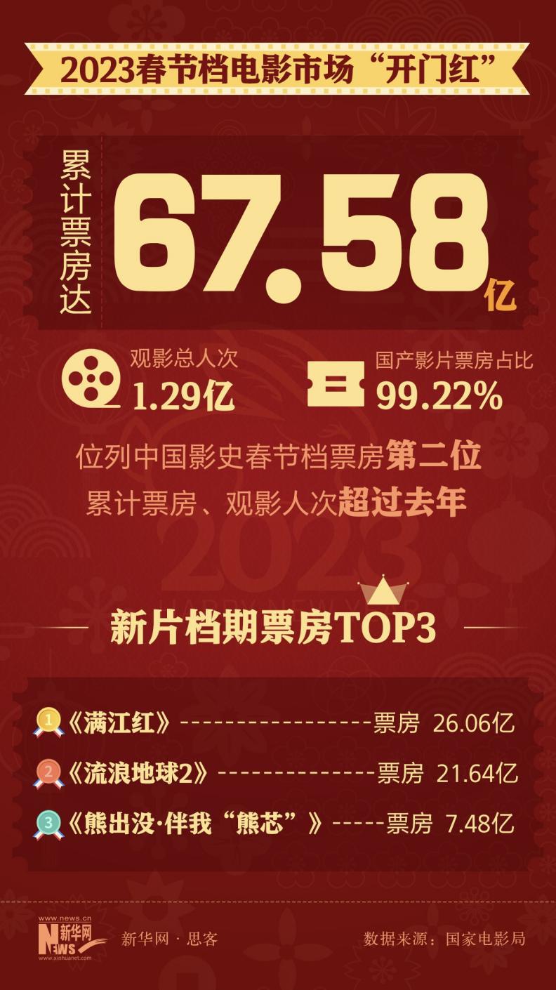 春节档历来被视作全年电影市场的风向标,受疫情影响沉寂多时的中国电影在今年春节档全面发力。据国家电影局初步统计,2023年春节档(除夕至正月初六,1月21日至1月27日)电影票房为67.58亿元,同比增长11.89%,位列影史春节档票房第二位,仅次于2021年春节档的78.42亿元;观影人次为1.29亿,同比增长13.16%;国产影片票房占比为99.22%。今年春节档影片类型更丰富,风格更多元,实现了票房与口碑双丰收,有力印证了我国文化市场的消费潜力,极大提振了市场复苏的信心。