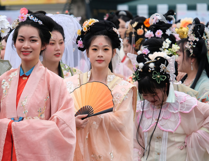 3月18日,身着古风服饰的人们在广西南宁园博园参加花朝盛典活动。新华社记者 周华 摄