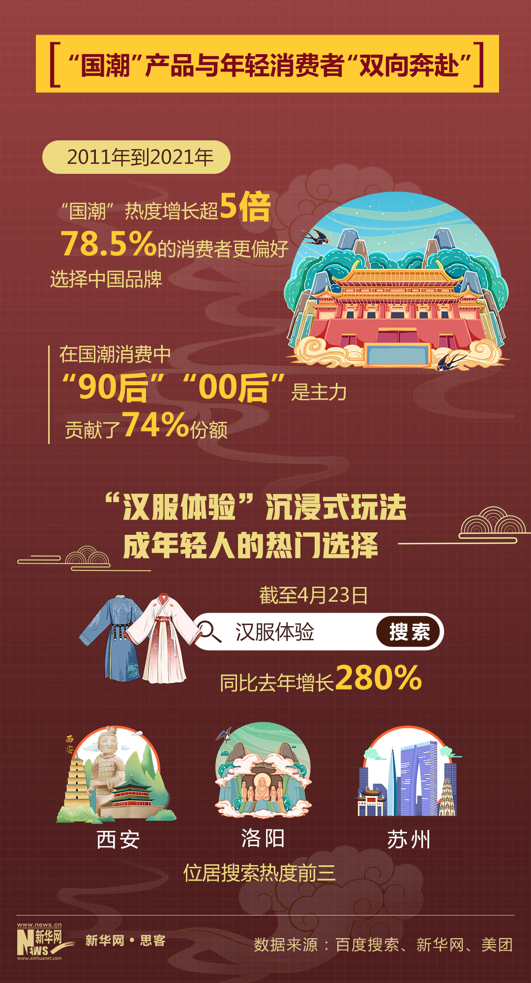 百度搜索大数据显示,从2011年到2021年这十年,“国潮”搜索热度涨幅528%;2022年底到2023年初,抖音关键词搜索指数显示,国潮在抖音上搜索量呈爆发增长。新华网以“得物App”为研究样本发布的《国潮品牌年轻消费洞察报告》显示,在这些追捧国潮的年轻消费者中,“90后”“00后”是主力,贡献了74%份额。