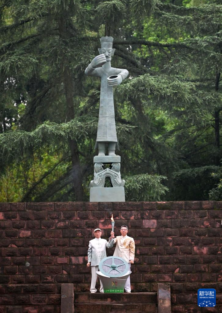 7月26日,三星堆博物馆代表肖先进(左)、金沙遗址博物馆代表朱章义在火种采集仪式上展示火种。