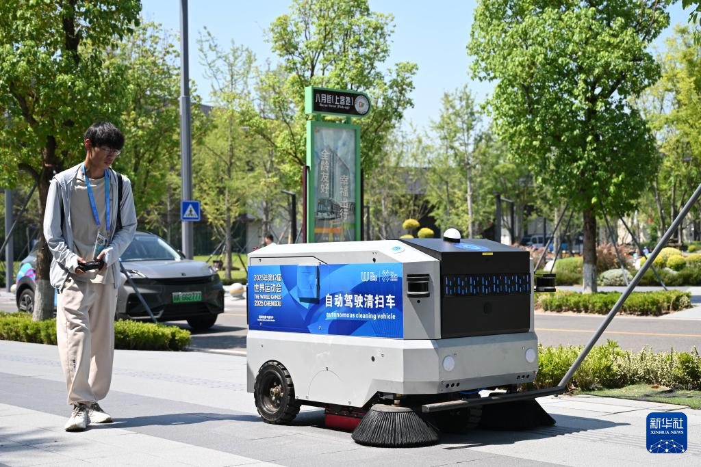 8月3日,在成都世运会运动员村,工作人员引导自动驾驶清扫车前往清扫区域。 新华社记者 胥冰洁 摄