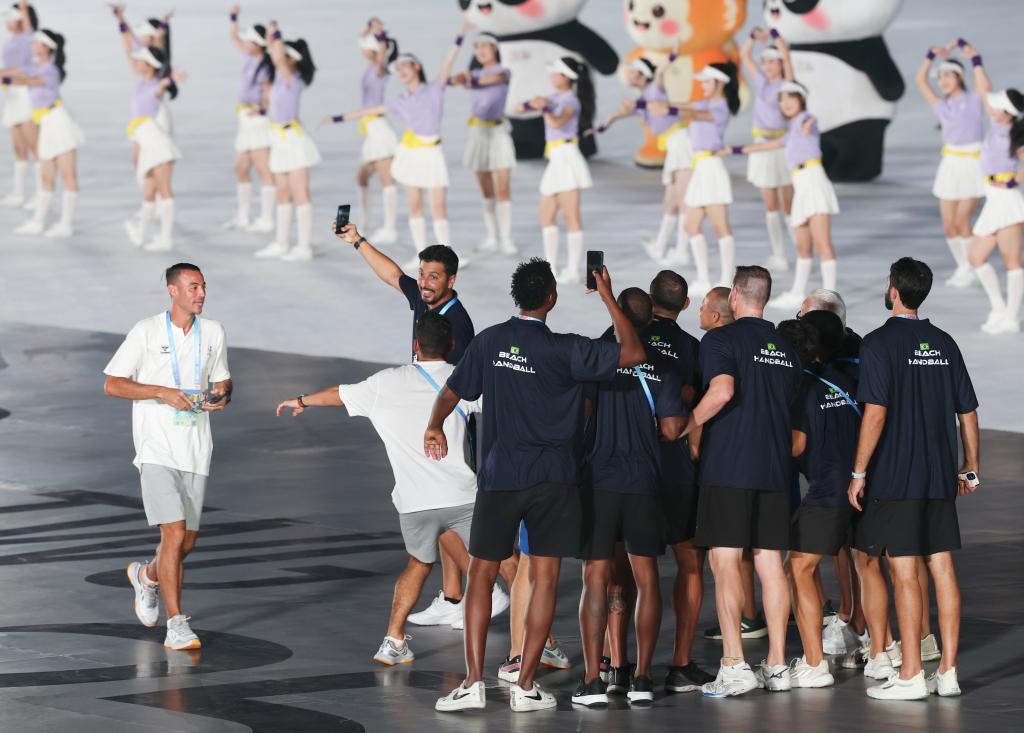 8月7日,巴西体育代表团成员在开幕式现场自拍留念。 新华社记者 姜克红 摄