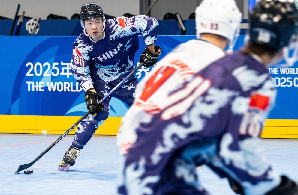 8月7日,中国队选手胡文瀚(左一)在成都世运会单排轮滑球男子A组预赛中。新华社记者 谢剑飞 摄