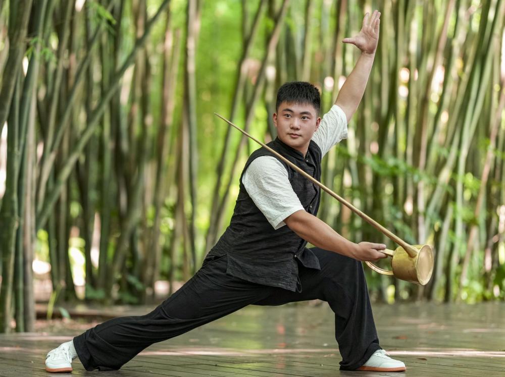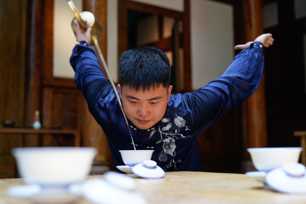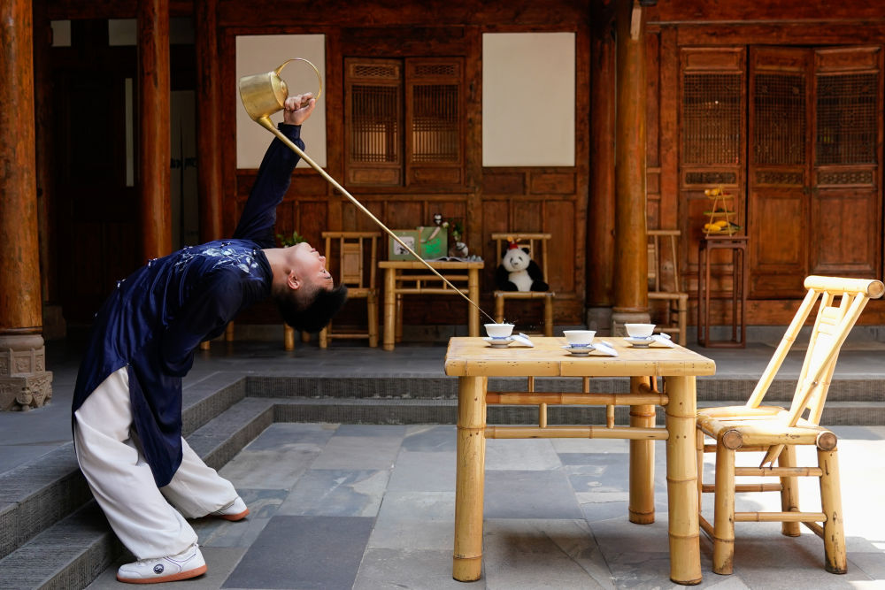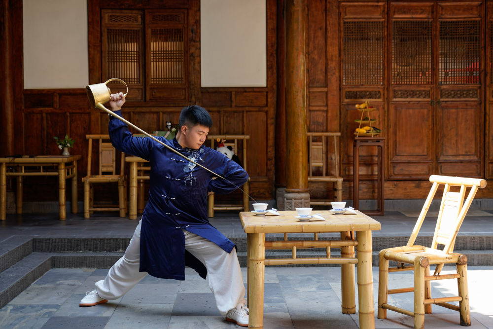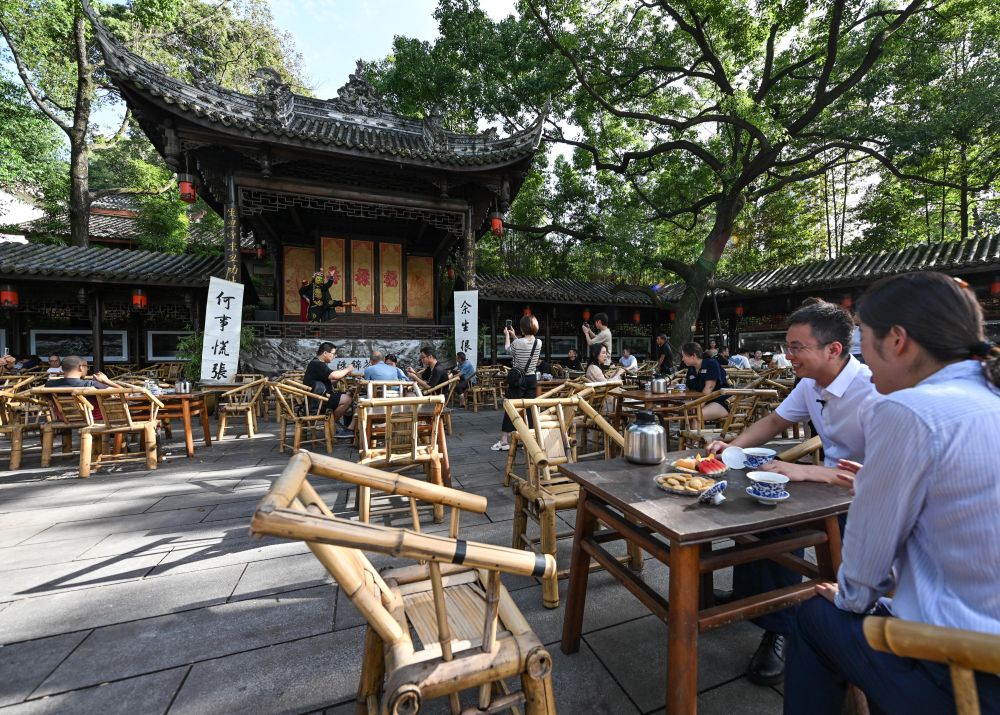 ↑在成都铁像寺水街,游客体验盖碗茶(2023年7月14日摄)。