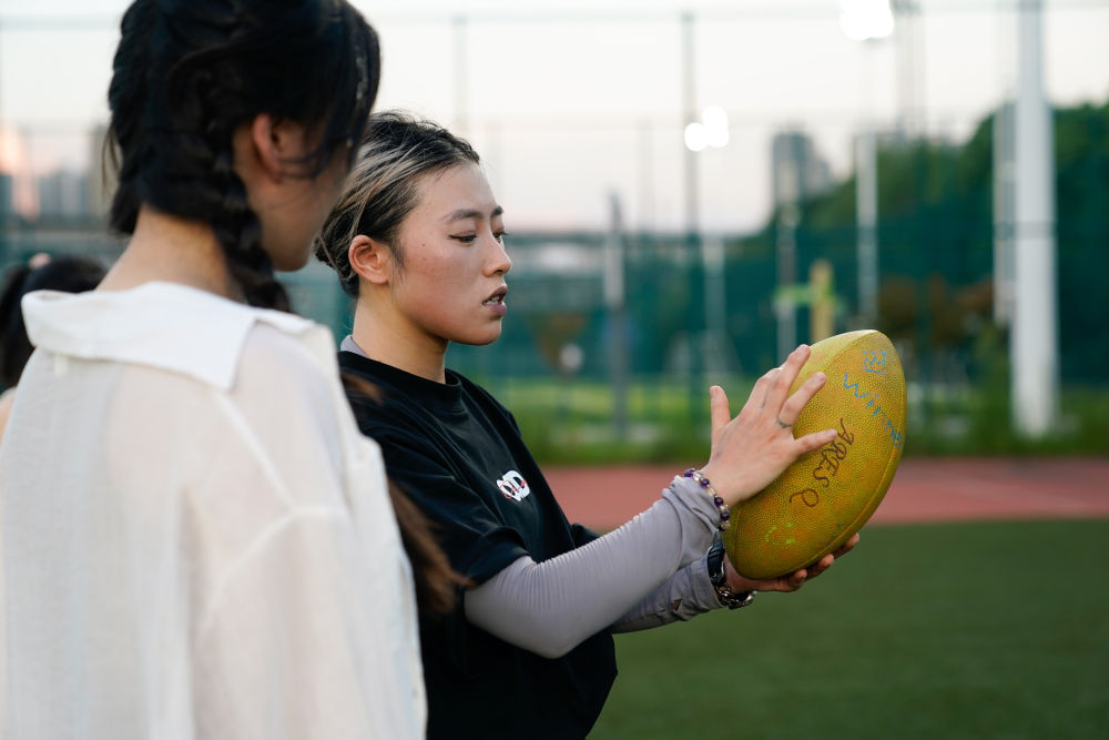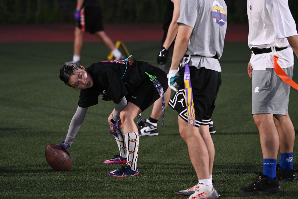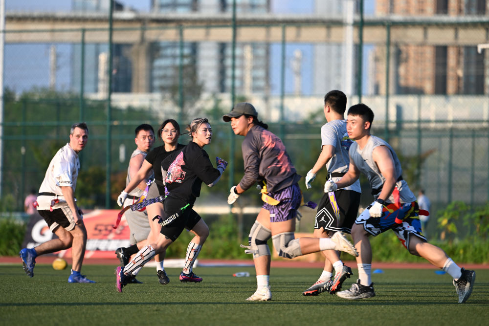 ↑在成都一处运动场,腰旗橄榄球爱好者在进行比赛(2025年3月8日摄,无人机照片)。