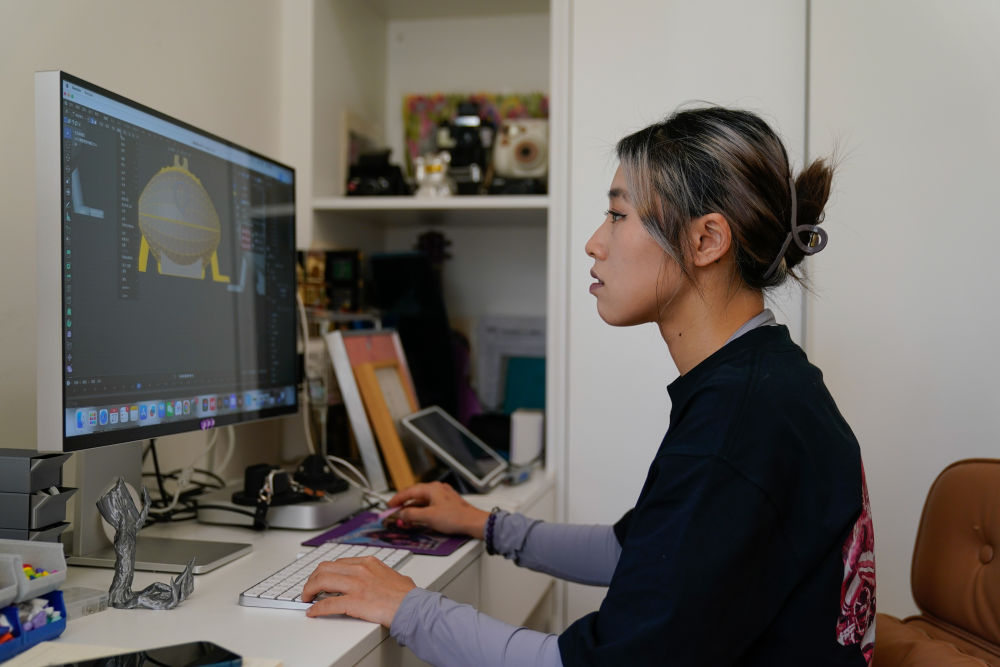 ↑吴庆文展示自己设计的攀岩文创挂件(7月27日摄)。