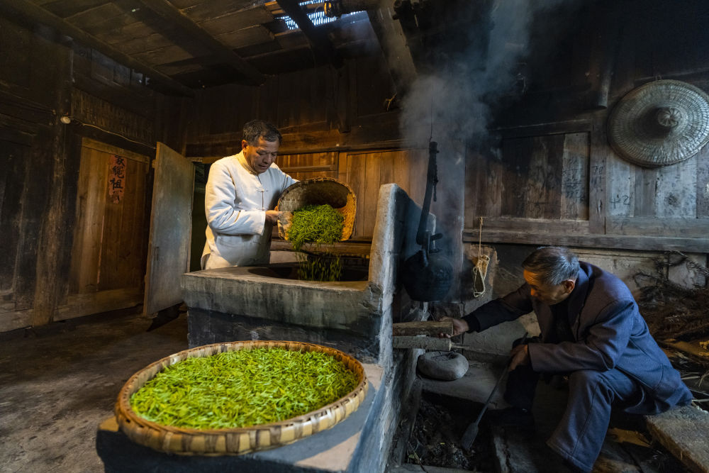 ↑制茶师(左)在雅安市蒙顶山制作绿茶(2022年3月31日摄)。