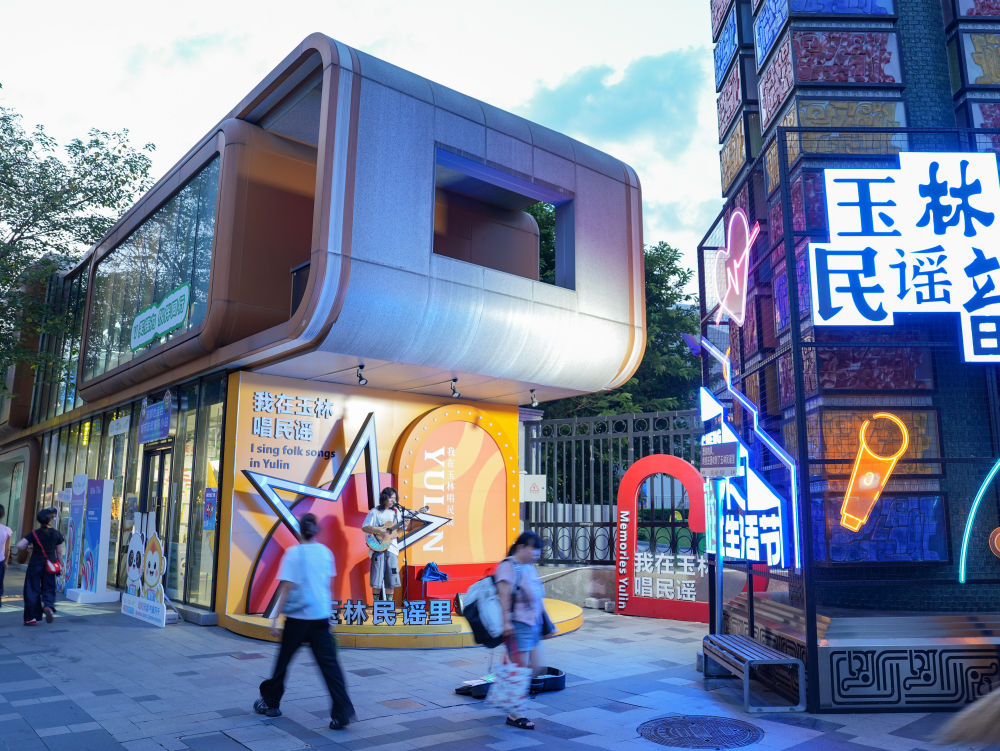 ↑在成都铁像寺水街,一位母亲带着儿子在玩滑板(2023年7月14日摄)。