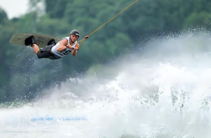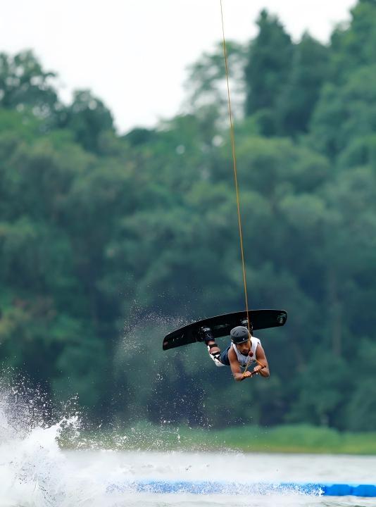 8月9日,意大利选手莱奥·加蒂在男子索道滑水复活赛中。新华社记者 贝赫 摄
