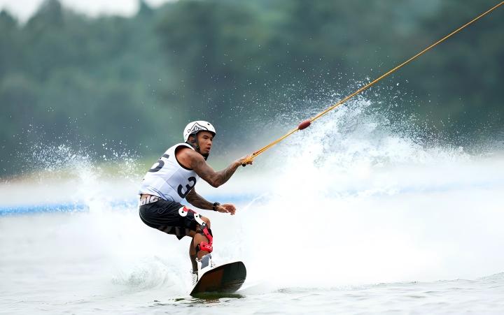 8月9日,中国选手张伟在男子索道滑水复活赛中。新华社记者 贝赫 摄