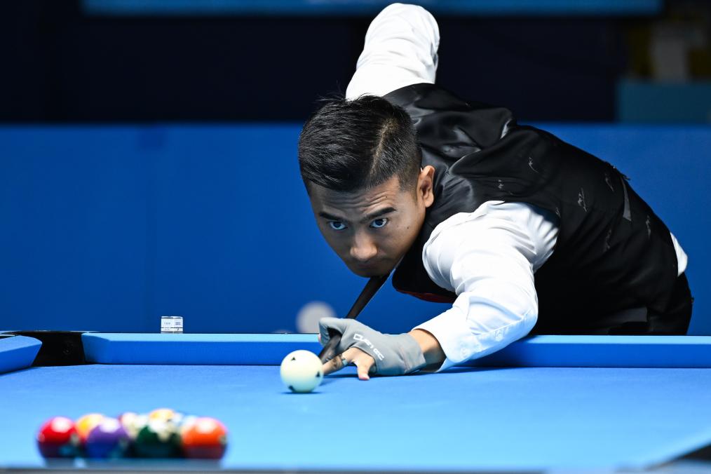 成都世运会10球项目的规则,是球员按照1至10号目标球依次击打,每局率先打进10号球的球员获胜。党金虎打进8号球,此刻球桌上仅余9号球与10号球,将这两球依次打进,他就能将比赛拖入决胜局,延续进入四强的希望。