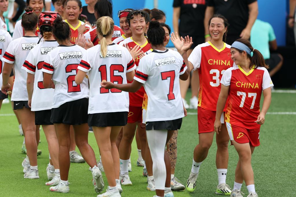 8月9日,中国棍网球队球员与加拿大队球员赛后击掌致意。新华社记者 陈斌 摄
