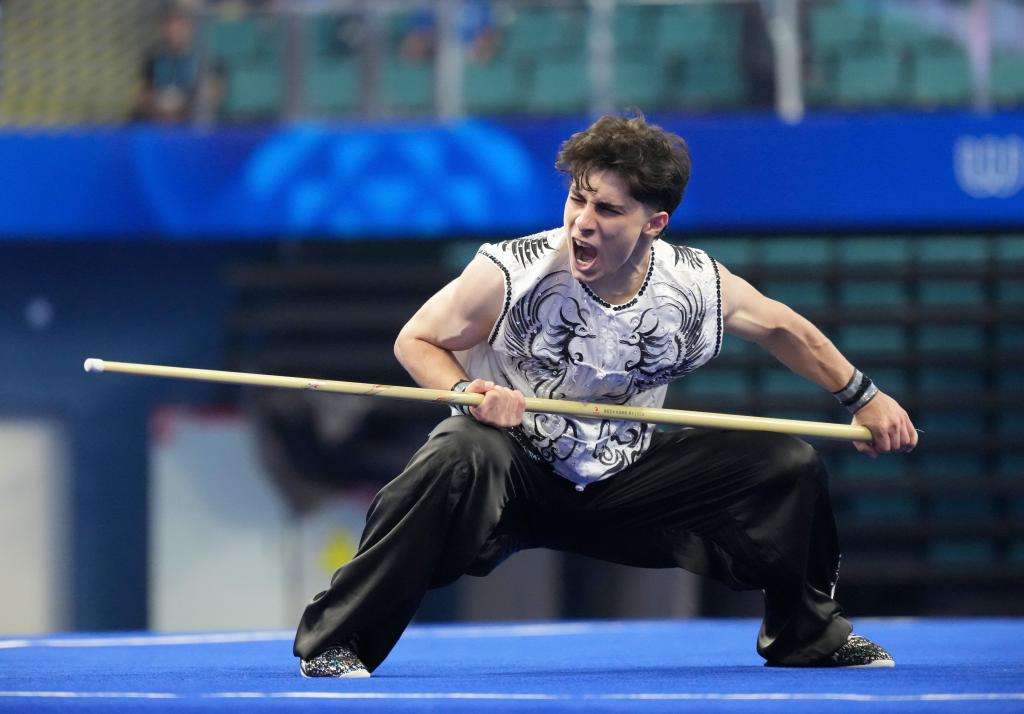 8月8日,伊朗选手沙欣在南棍比赛中。新华社记者 徐速绘 摄