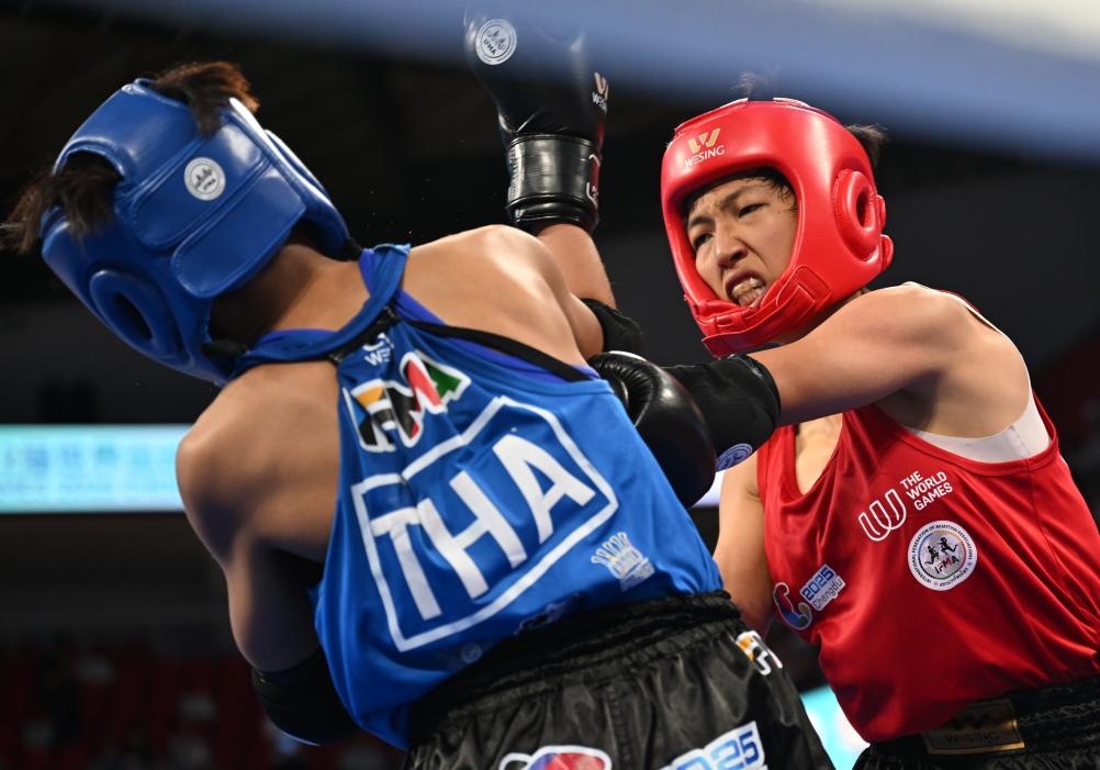 8月10日,在2025年成都世运会女子48公斤级泰拳决赛中,中国选手刘晓慧战胜泰国选手奥诺克夺冠。新华社记者 张博文 摄