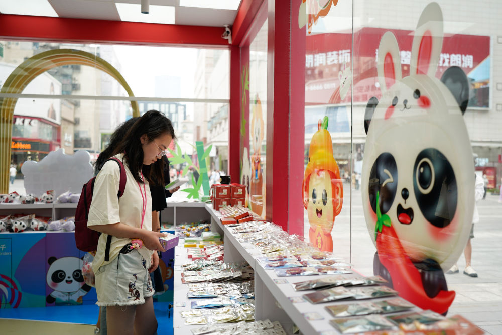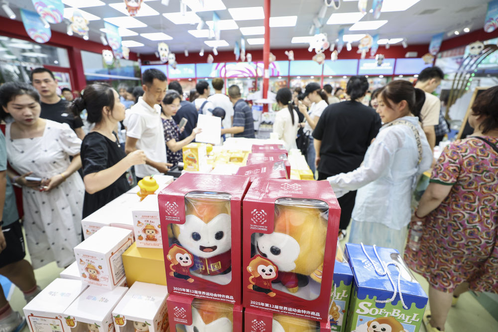 ↑7月8日,顾客在成都春熙路的一家世运会官方特许商品零售店选购。新华社记者胥冰洁摄