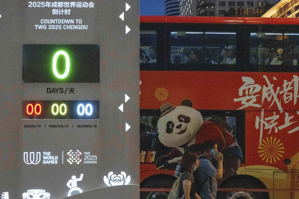 ↑8月7日,人们在成都天府广场上的世运会倒计时牌前拍照。新华社记者谢剑飞摄