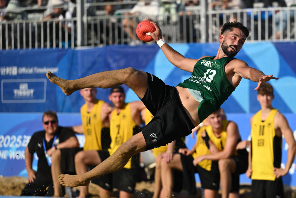 ↑8月12日,葡萄牙队球员科斯塔在世运会沙滩手球男子决赛中进攻。新华社记者陈振海摄