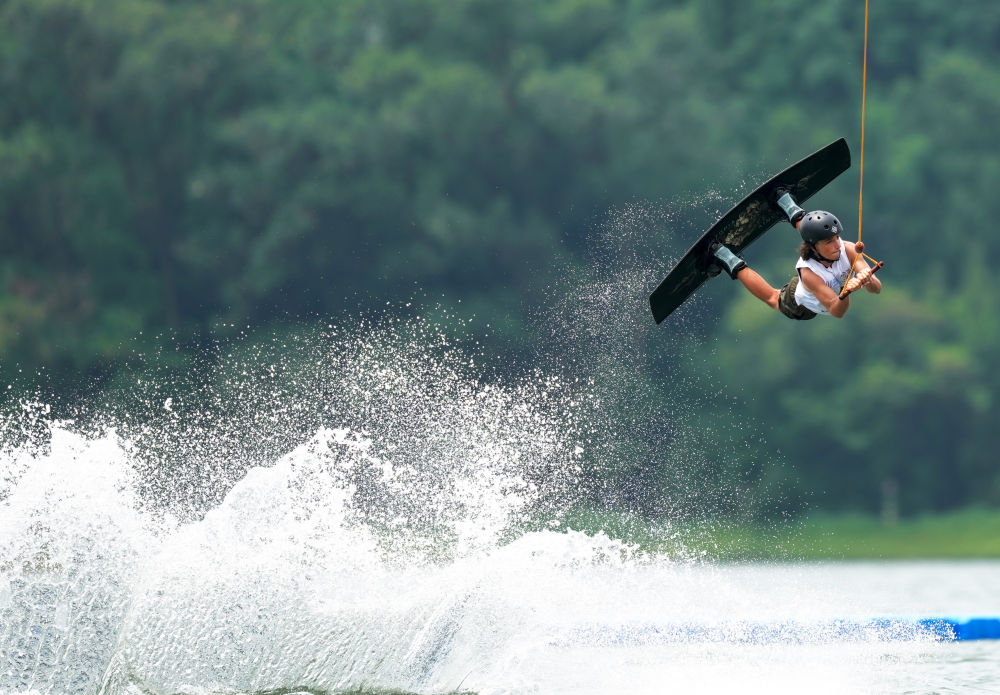 ↑8月9日,美国选手克劳迪奥在世运会男子索道滑水复活赛中。新华社记者贝赫摄