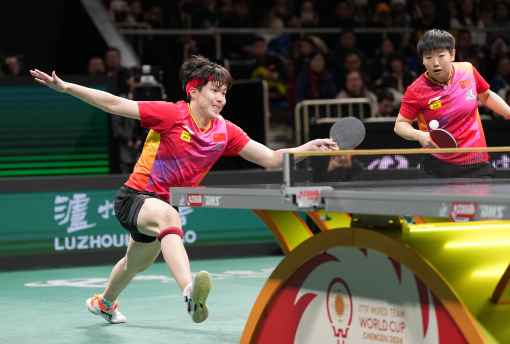 ↑2024年12月8日,中国队选手王楚钦(左)/孙颖莎在2024年成都国际乒联混合团体世界杯决赛中。最终,中国队获得冠军。新华社记者江宏景摄