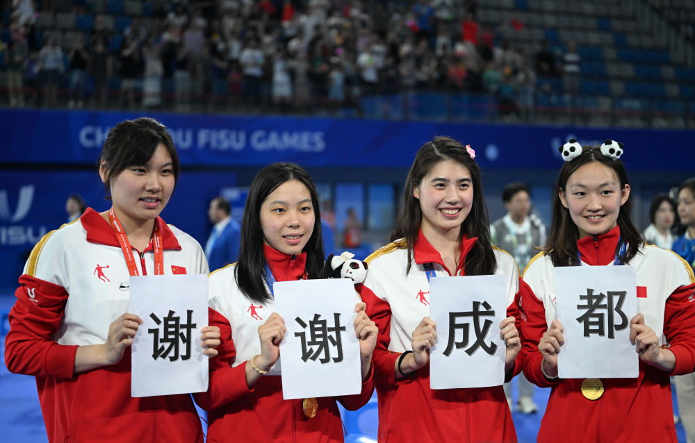 ↑2023年8月7日,在成都大运会游泳比赛现场,中国女子4x100米混合泳接力队手持“谢谢成都”标语合影。新华社记者张龙摄