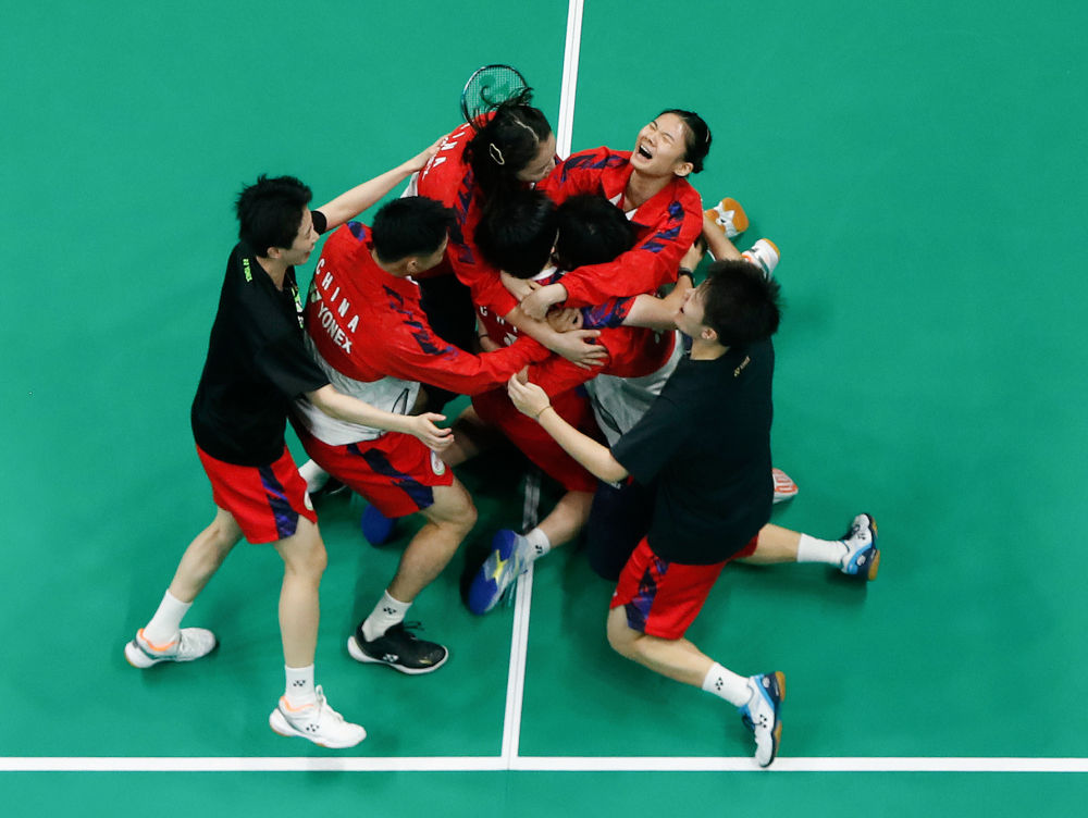 ↑2024年5月5日,中国队庆祝夺得2024年尤伯杯冠军。新华社记者贾浩成摄