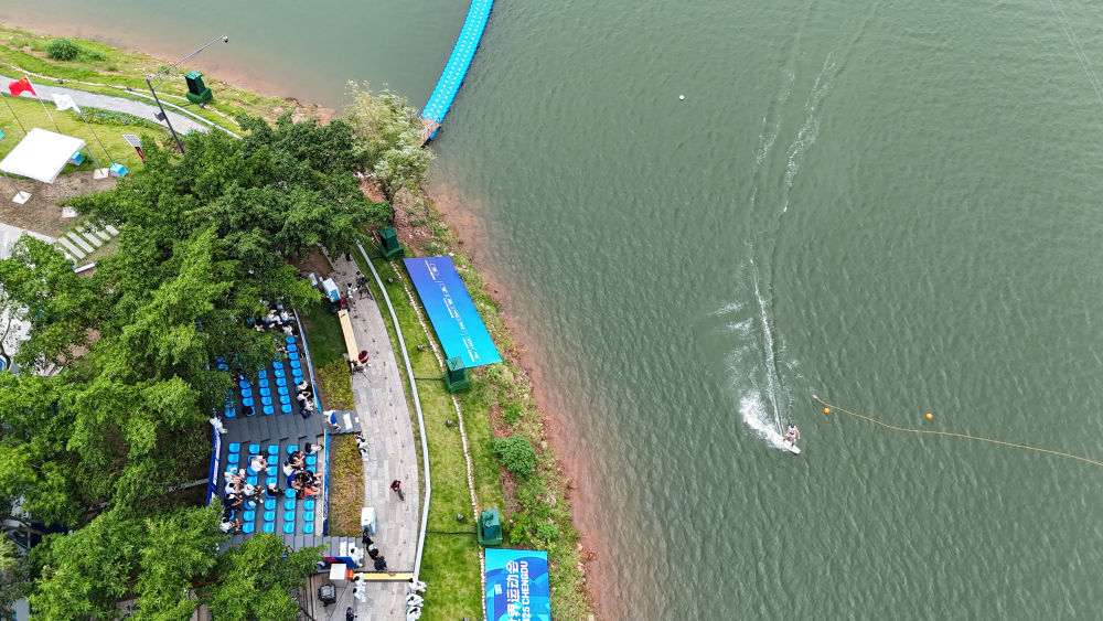 ↑这是8月9日在成都三岔湖桃花岛拍摄的索道滑水项目比赛现场(无人机照片)。新华社记者邵泽东摄