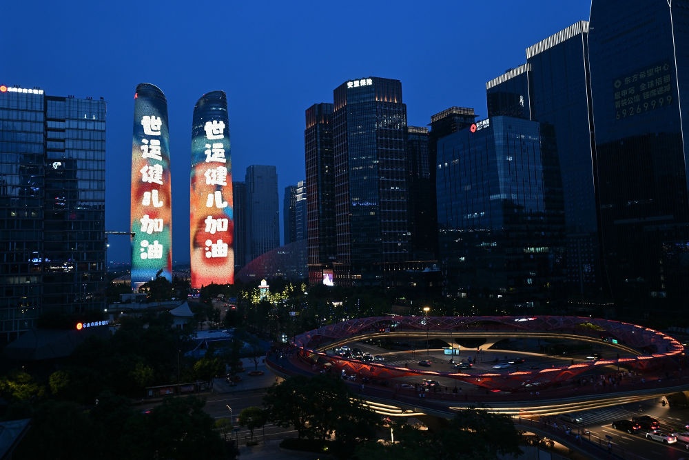 ↑这是8月7日拍摄的成都双子塔世运会主题灯光秀。新华社记者杨文斌摄
