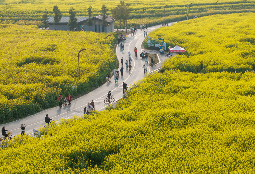 ↑3月13日,人们在成都高新区一处油菜花田旁骑行(无人机照片)。新华社记者江宏景摄