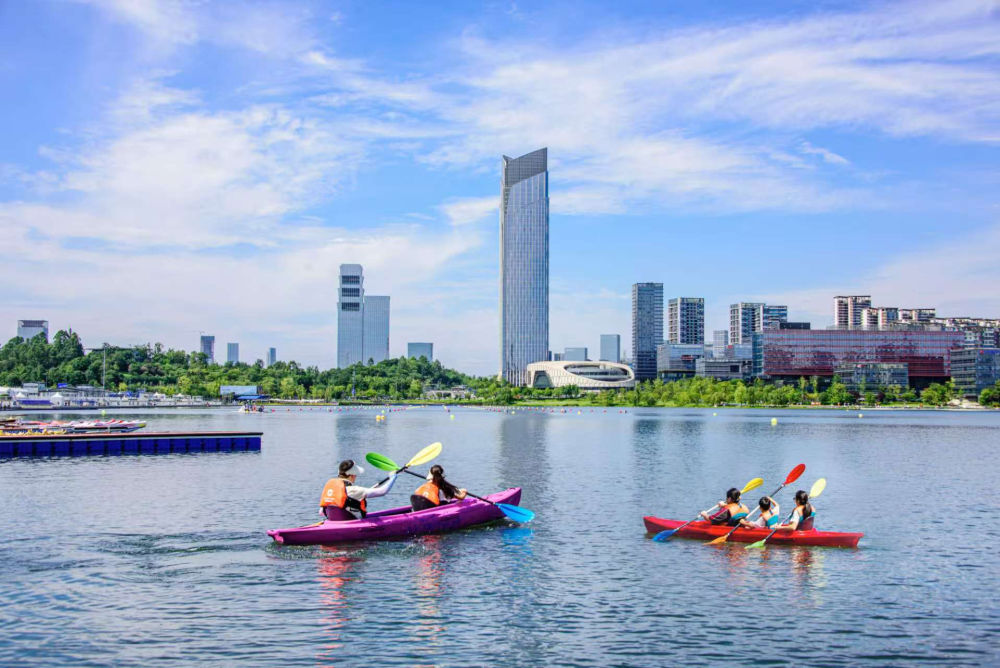 ↑7月26日,人们在成都市兴隆湖体验皮划艇。新华社发(张治平摄)