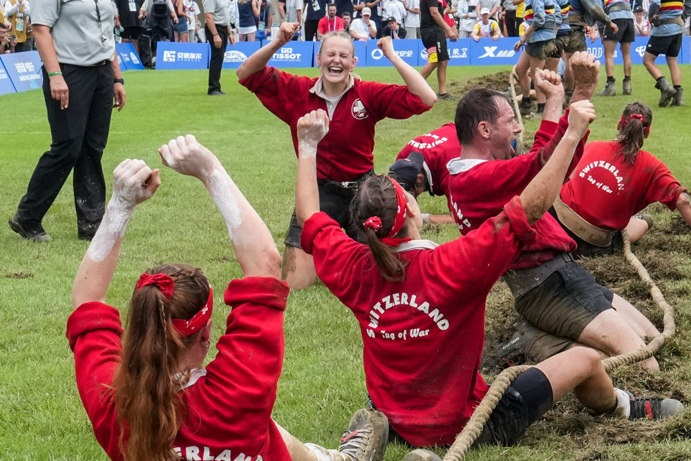 ↑8月11日,瑞士队队员在世运会混合室外拔河580公斤级赛后庆祝。新华社记者李博摄