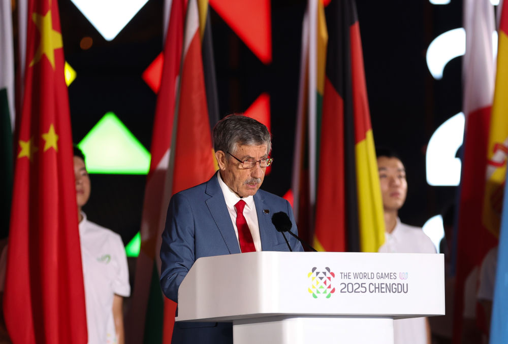 8月17日,国际世界运动会协会主席何塞·佩鲁雷纳在闭幕式上宣布成都2025年第12届世界运动会闭幕。新华社记者 丁增尼达 摄