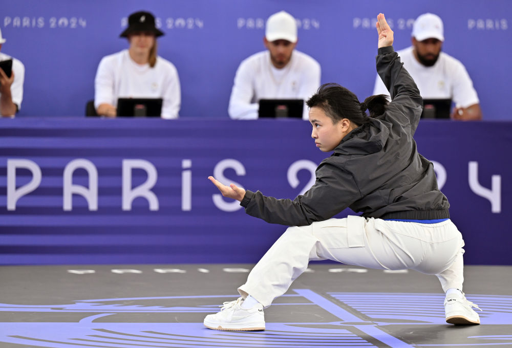 2024年8月9日,中国选手刘清漪在比赛中。当日,巴黎奥运会霹雳舞项目女子循环赛在巴黎协和广场举行。新华社记者 刘勇贞 摄