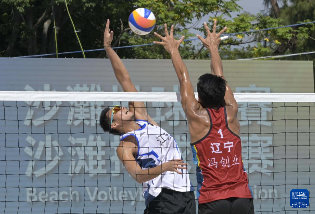11月6日,江苏一队球员周朝威(左)在比赛中扣球。最终,江苏一队组合吴佳欣/周朝威2比0战胜辽宁二队组合冯创业/周守郅,晋级1/4决赛。