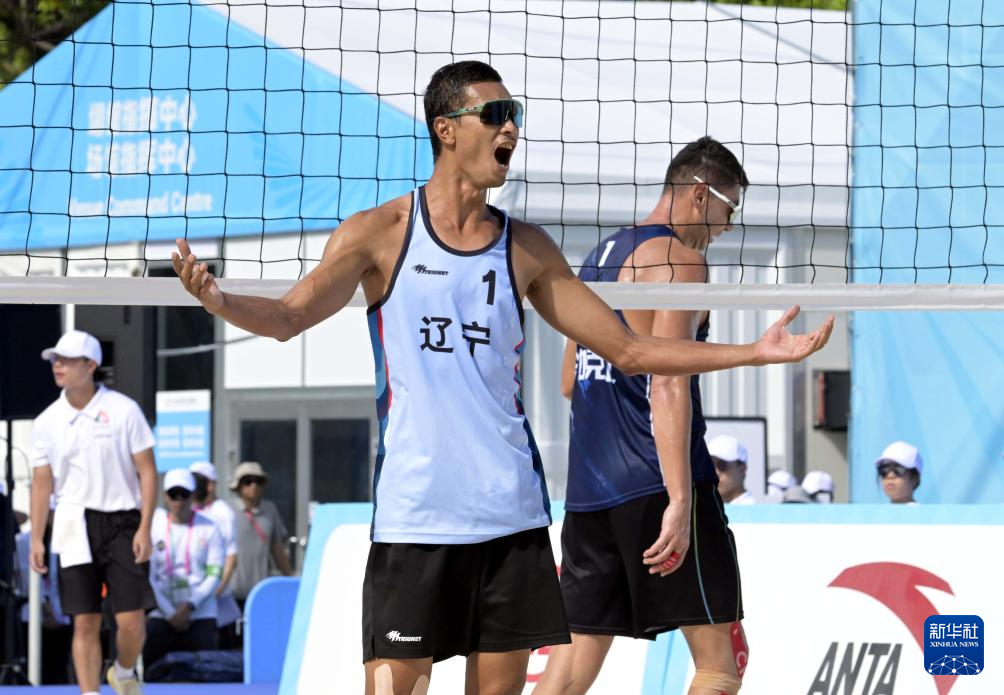 11月6日,辽宁一队选手李焯新庆祝得分。最终,辽宁一队组合李焯新/薛涛2比0战胜新疆一队组合哈力克江/萨拉木,晋级1/4决赛。
