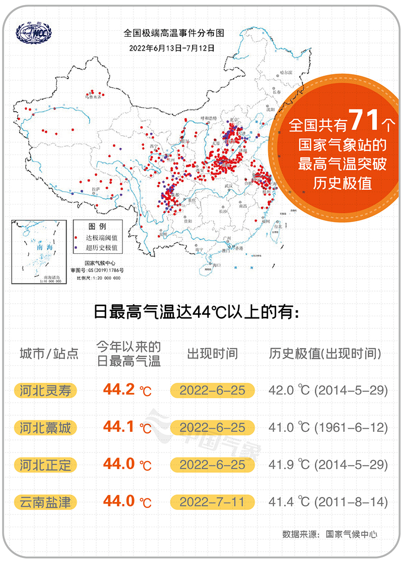 中國(guó)氣象局的一項(xiàng)數(shù)據(jù)統(tǒng)計(jì)顯示,6月以來,河北、河南、天津、云南、四川、浙江、新疆等地共有238個(gè)國(guó)家氣象站日最高氣溫突破月極值,共有71個(gè)國(guó)家氣象站日最高氣溫突破歷史極值。其中,6月25日是6月以來高溫極值站點(diǎn)最多的一天。當(dāng)天28個(gè)站日最高氣溫突破歷史極值,日最高氣溫前十的站點(diǎn)均出現(xiàn)在河北。