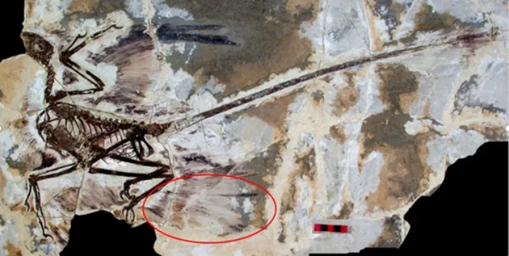 不对称的羽毛不仅分布在小盗龙化石前肢和尾巴上,还分布在后肢上(红圈处)。(供图 /徐星)