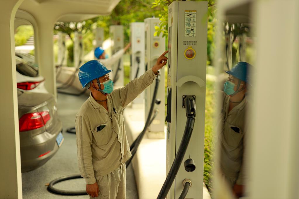 6月16日,供電公司技術人員在重慶首座光伏充電發用一體充電站進行設備日常安全檢查。新華社記者 劉潺 攝