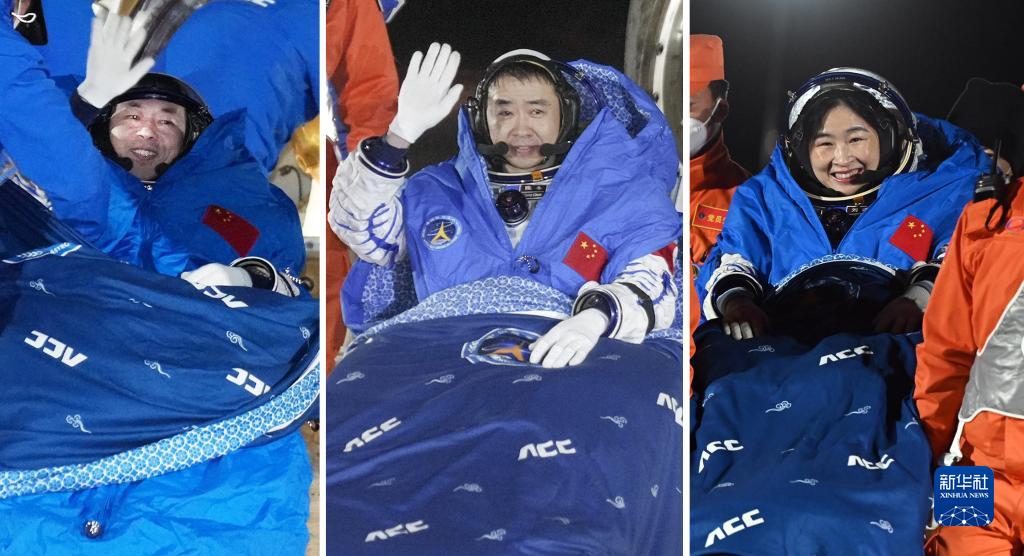 12月4日,神舟十四號載人飛船返回艙在東風著陸場成功著陸。這是航天員陳冬(中)、劉洋(右)、蔡旭哲安全順利出艙(拼版照片)。新華社發