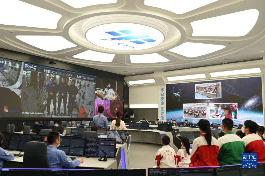 10月12日,在中科院空間應用工程與技術中心地面主課堂,學生收看“天宮課堂”第三課。新華社記者 羅曉光 攝