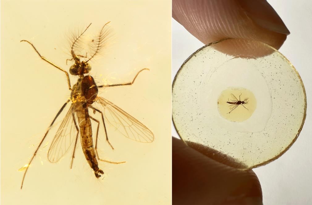 此次發(fā)現(xiàn)的雄蚊化石標本(左為琥珀中的遠古蚊子標本,右為琥珀薄片)。(中國科學院南京地質古生物研究所供圖)