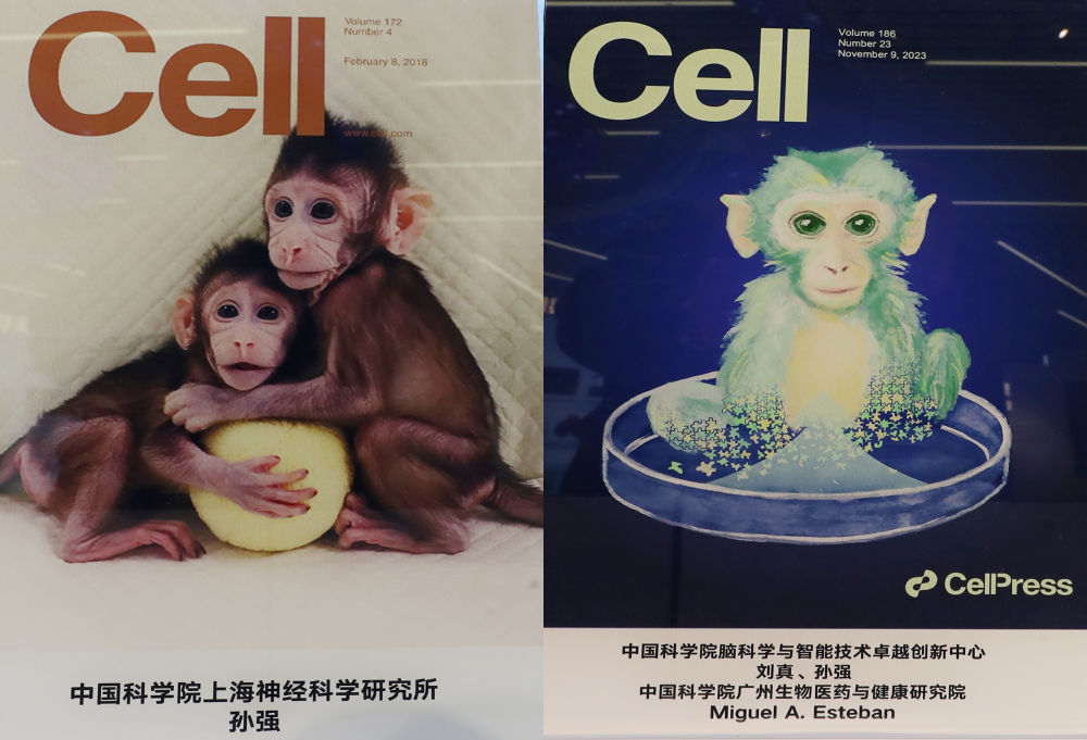 拼版照片是2023年11月29日在上海科技創(chuàng)新成果展上拍攝的雜志封面,左為《細(xì)胞》封面的克隆猴“中中”和“華華”,右為《細(xì)胞》封面的一只來自中國的“嵌合猴”。新華社記者 方喆 攝