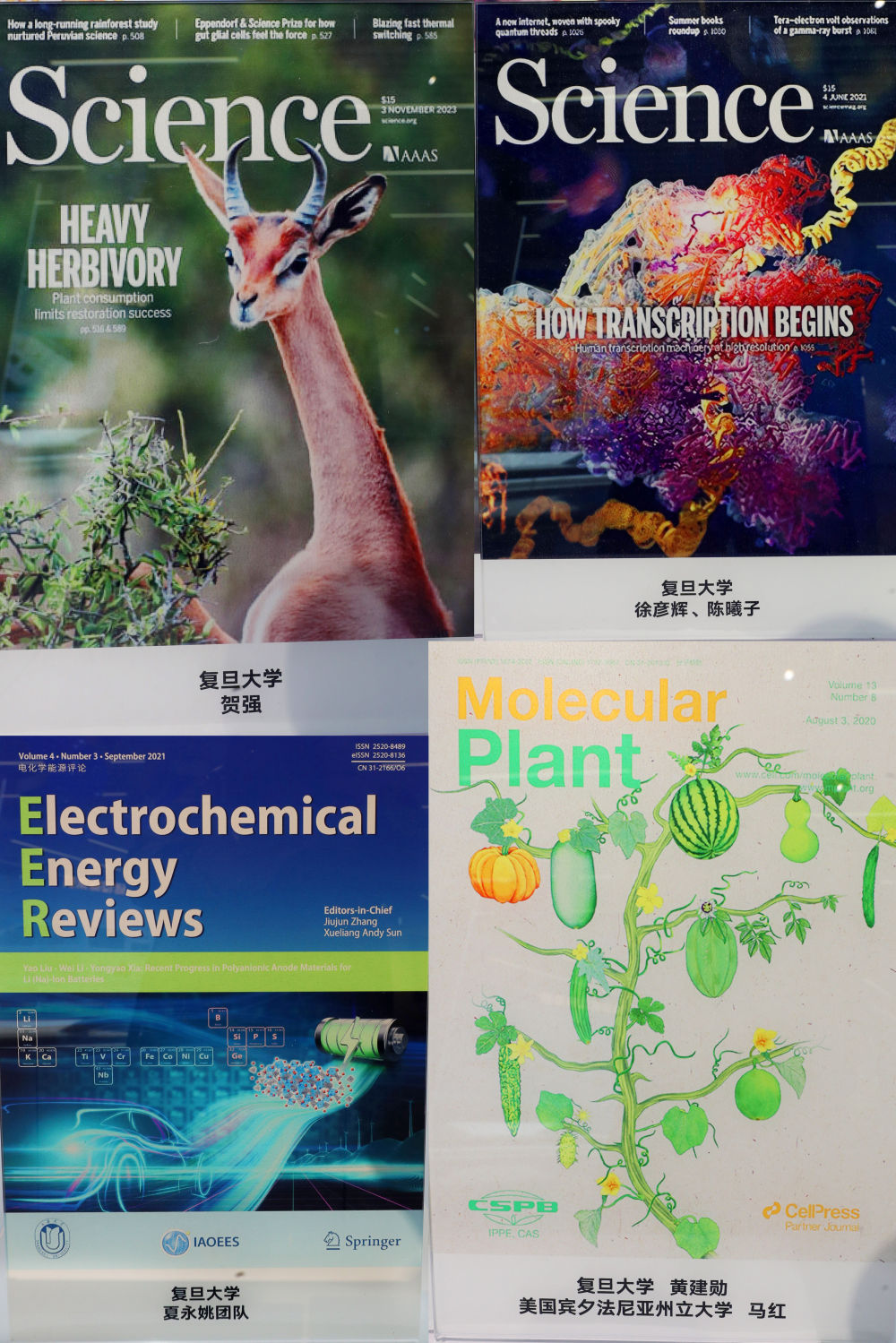 拼版照片是2023年11月29日在上海科技創(chuàng)新成果展上拍攝的以復(fù)旦大學(xué)科研成果為封面的刊物。新華社記者 方喆 攝