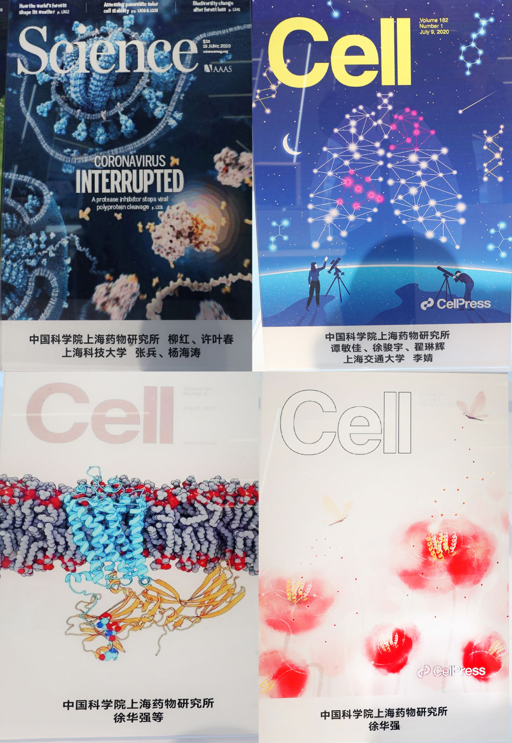 拼版照片是2023年11月29日在上海科技創(chuàng)新成果展上拍攝的以中國科學(xué)院上海藥物研究所科研成果為封面的刊物。新華社記者 方喆 攝